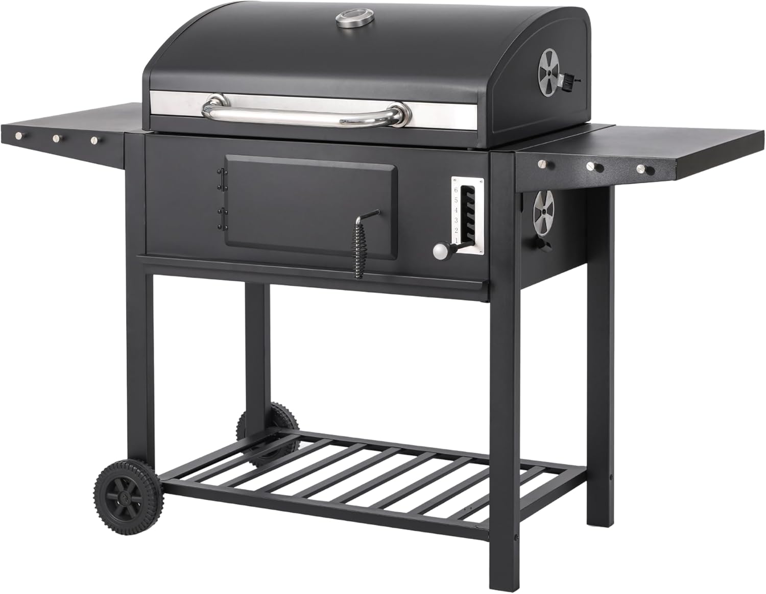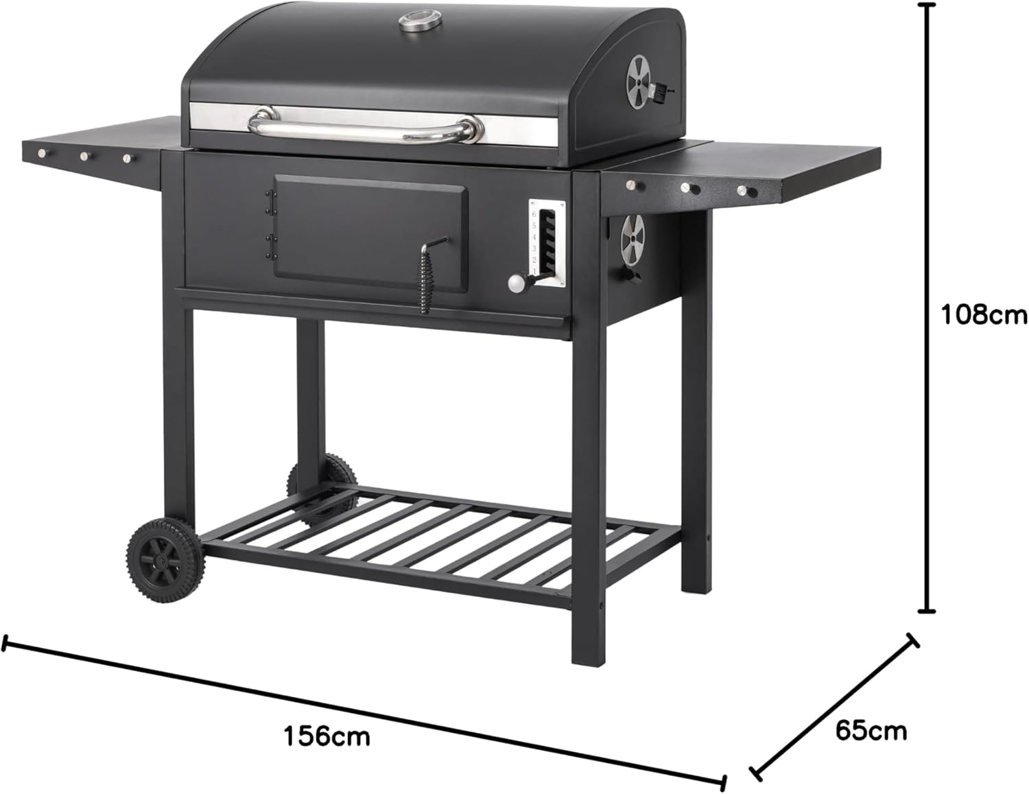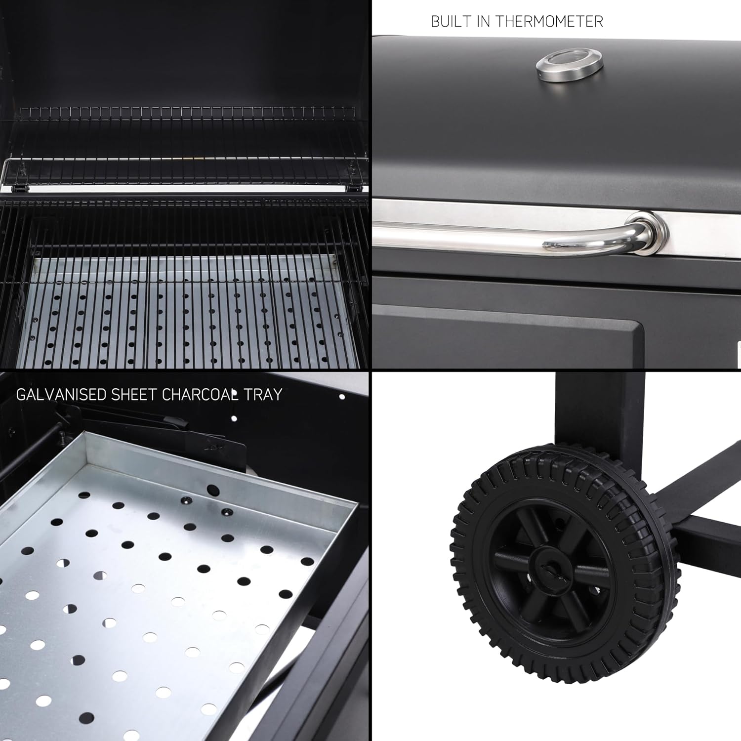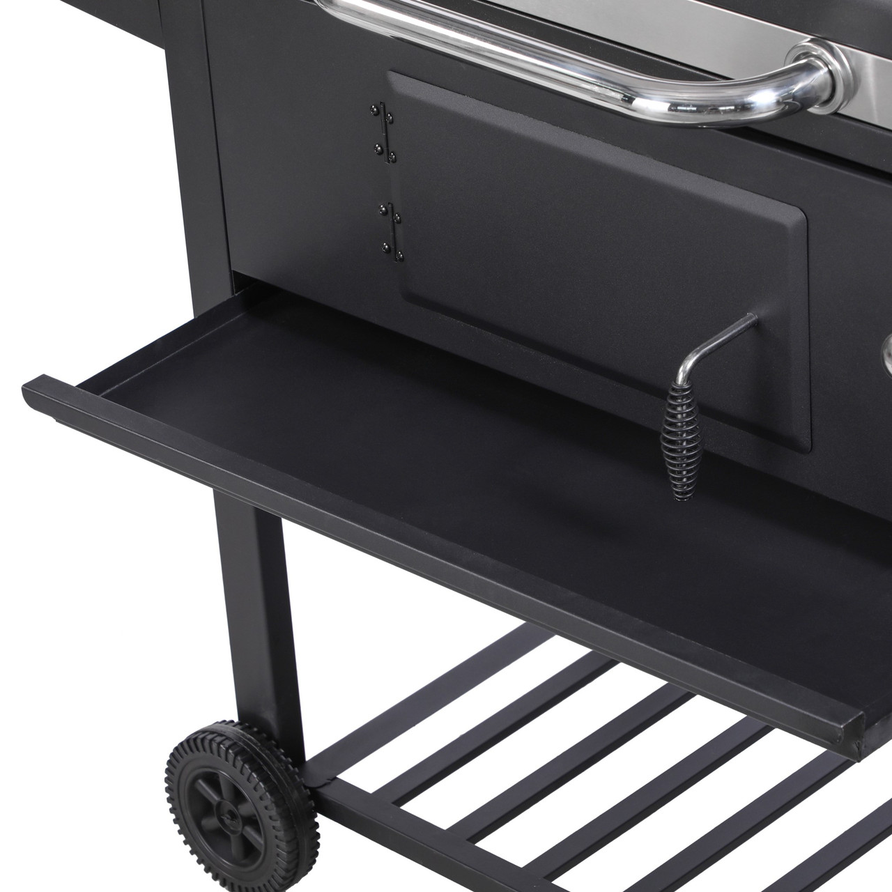 Designed with practicality in mind, the grill includes foldable side tables for extra prep space and a lower storage rack to keep essentials within reach. Cleanup is quick and easy thanks to the galvanised charcoal tray, accessible charcoal door, and removable ash tray.