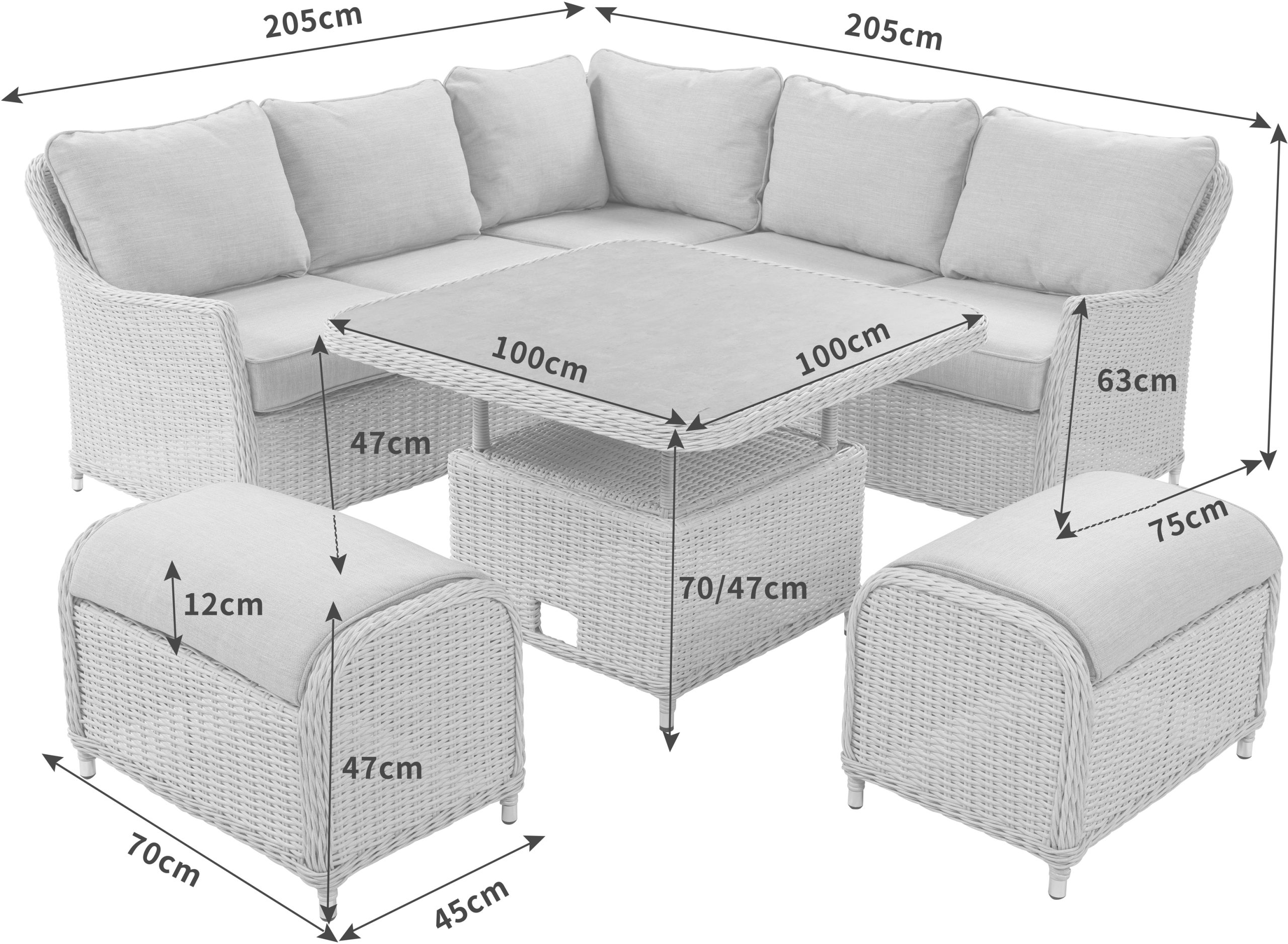 Designed for both relaxation and entertaining, this sophisticated garden set features a generously sized corner sofa that comfortably seats six, creating the perfect space for family gatherings or summer evenings with friends. The addition of two versatile stools provides extra seating when needed or doubles as comfortable footrests when it’s time to unwind.